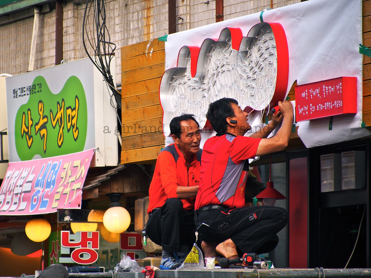 Though we’ve come across wisps of its presence before – the remnants of the old Yongsan red light district, the businesses advertising widows and targeting older men in Jongno-5-ga – the red light district here was both the largest and most brazen display of Seoul’s sex trade that we’ve yet encountered in the course of the project. Still, though, it was Sunday afternoon and Sunday afternoons for working girls are pretty much like those for everyone else. Businesses were closed and laundry racks of drying pink towels stood in the sun outside several front doors. As I headed back toward the main street I once again passed the apartments of the two girls who were working, and as I did they both said, ‘Hey!’ and gave a friendly wave to come in, which I appreciated. No discrimination. I smiled and waved back and kept walking.