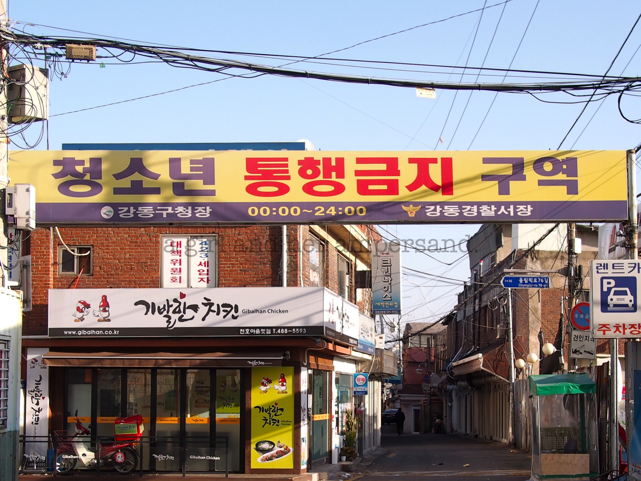 Cheonho-daero-157-gil (천호대로157길) is marked by a pair of giant silver fangs and a sign identifying it as the local Rodeo Drive (로데오거리). A single narrow lane of infrequent traffic with wide, meandering sidewalks, it’s a pedestrian friendly place. This particular Rodeo is far less shopping-centric than other Rodeos throughout the city, its clothing stores outnumbered by restaurants and upper-story bars and noraebangs. A mall near the street’s entrance is the main shopping venue. The Cheonho neighborhood is also characterized by a prevalence of churches and proselytizing church groups, and another such group had set up in front of the mall. Some of its members were handing out packs of tissues while a half dozen others had set up microphones and speakers and were signing praise music, accompanied by a guitar. This sort of activity usually grates on me, but the group here was actually half-decent and, almost in spite of myself, I found that I wasn’t annoyed. Then, suddenly, for some reason or another their speakers cut mid-song and at once the song sounded tiny and far away.