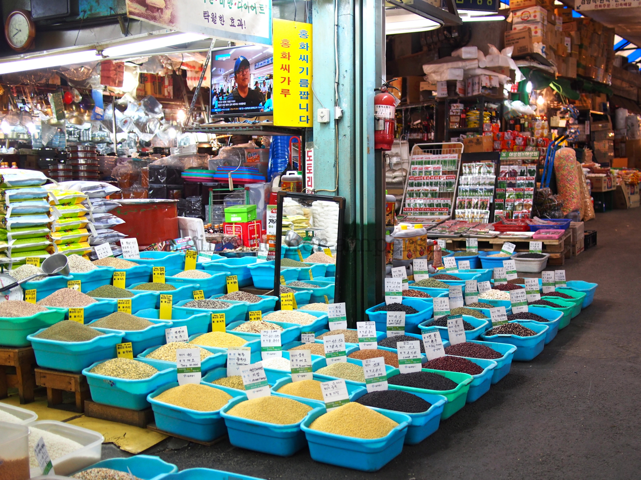 The far end of Rodeo opened onto a small plaza where stalls sold sparkly, garishly patterned ajumma clothes, and yet one more church group was handing out literature. The station map marked the junction here as Cheonho Old Intersection (천호구사거리), and, indeed, this is the one corner of the neighborhood that I came across with a distinctly older hue to it, the type of place where commerce was strictly conducted in the cash from hand to hand method. On the opposite side of Gucheonmyeon-ro (구천면로) began Cheonho Market (천호시장), which was in stark contrast to the Rodeo I’d just walked down. On the sidewalk aged vendors sold small piles of fruit and vegetables or steaming corn and sweet potatoes. Others offered a variety of medicinal twigs, roots, and aloe leaves. A collection of pork trotter restaurants crowded an alley leading off the main street, and further back the market held giant bags of dried chilies, bins of dried anchovies and shredded fish, and large white cubes of tofu stacked up like igloo blocks. The smell of shit hung in the air. There were no customers, just ajumma vendors sitting and talking.