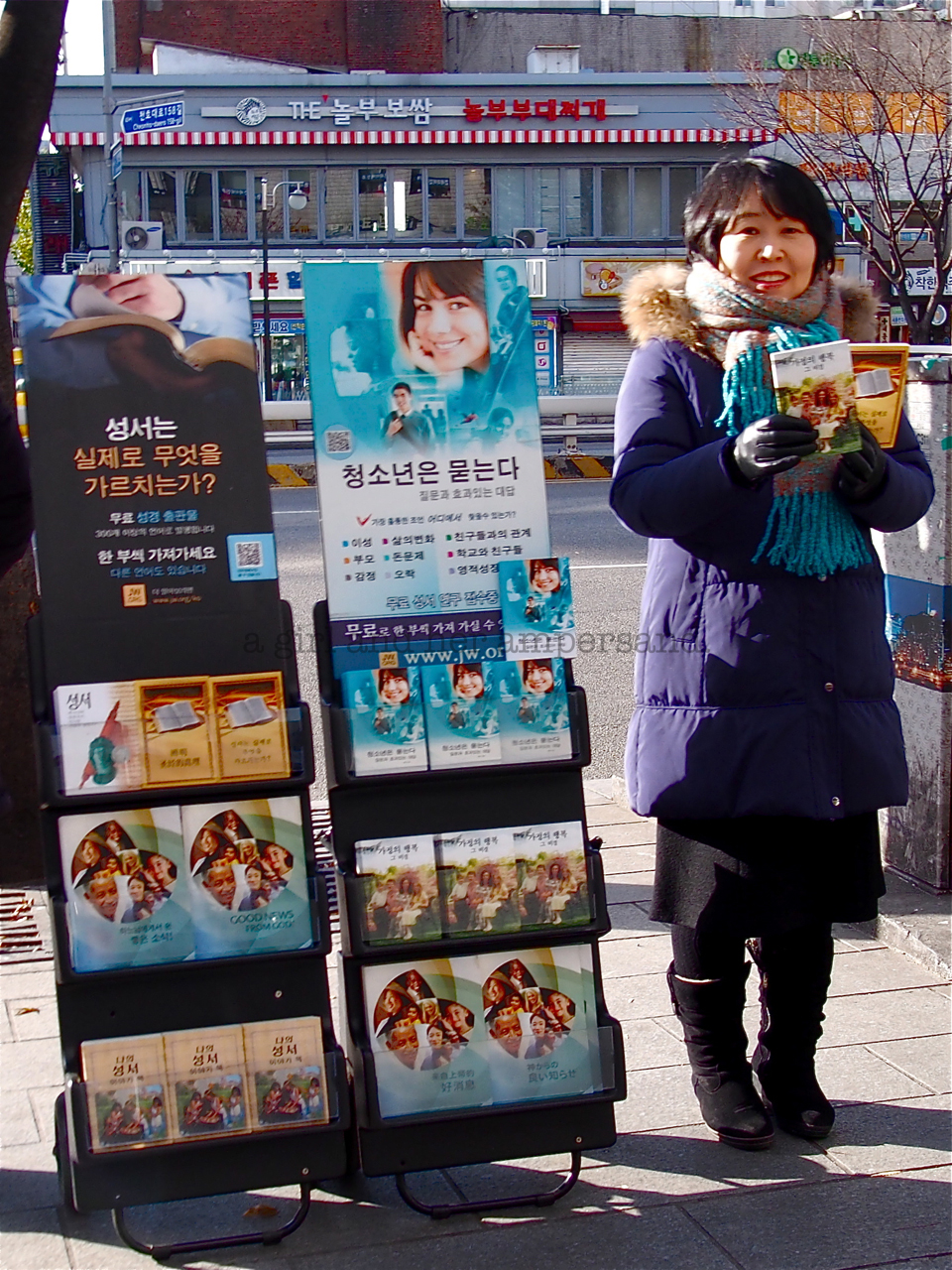 Despite its ancient lineage, most of Cheonho is, like the restof the southeast side, unmistakably modern and well-heeled. When I first arrived and headed out of Exit 4, it was past shoppers poring over racks of shoes at the attached Hyundai Department Store, and outside traffic streamed down the broad avenues and over Cheonho Bridge. The sidewalks near Exit 5 were filled with people – local families, ajummas with parasols, a navy officer and his girlfriend. (Nothing is whiter than a navyman’s whites.) The smell of sweet breads and donuts wafted from a Tous les Jours sidewalk stand and a woman on the sidewalk was trying to recruit blood donors from passers-by. This is a tactic that I’ve frequently seen employed by blood banks in Seoul, and it’s one that never fails to baffle me, since blood donation isn’t exactly the sort of thing that the average person decides to do on a whim. It almost goes without saying that I’ve never seen one of these pitchwomen actually reel someone in.
