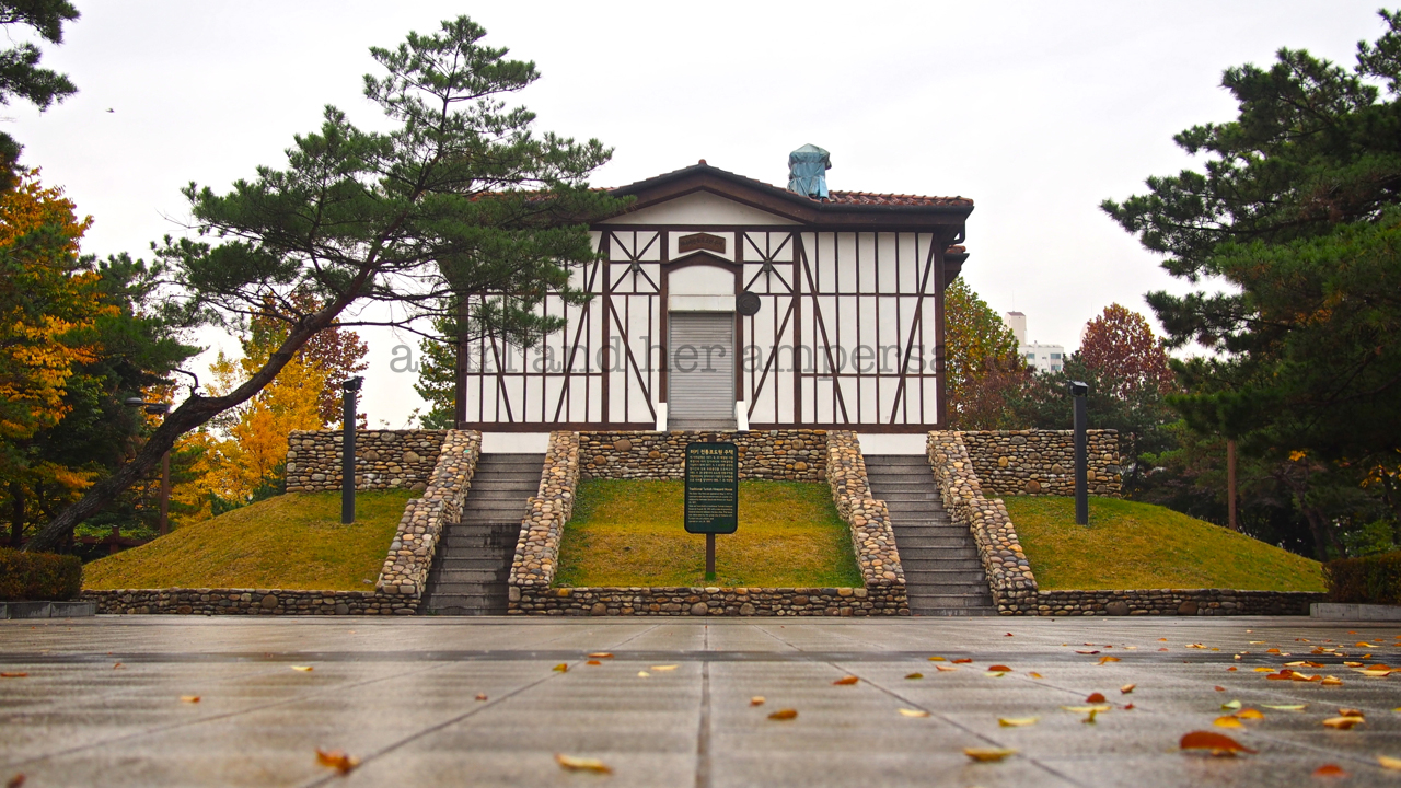 A sign at the park’s main entrance (slightly further down Yeouidaebang-ro (여의대방로) from the exit) had photos displaying the house’s interior, where a low couch with elaborately designed pillows surrounded a hookah sitting on a Turkish carpet, and overhead a metal and glass chandelier dangled from the ceiling. In the kitchen, dishes were set on racks for display and jars of spices lined up on a shelf. I walked up a set of stairs on the side of the house facing the park entrance, but steel shutters were pulled down over the door. On the ground next to it a slab of cardboard was laid out, another piece of cardboard rolled up and placed underneath one end, as if forming a pillow, making me think that a homeless person had used it as a bed and perhaps was planning on sleeping there again that night. Walking around to the back of the house, which was actually the front door, I found that that too was closed, but there was at least a sign explaining that Sunday was the wrong day to come. The house is only open on weekdays.