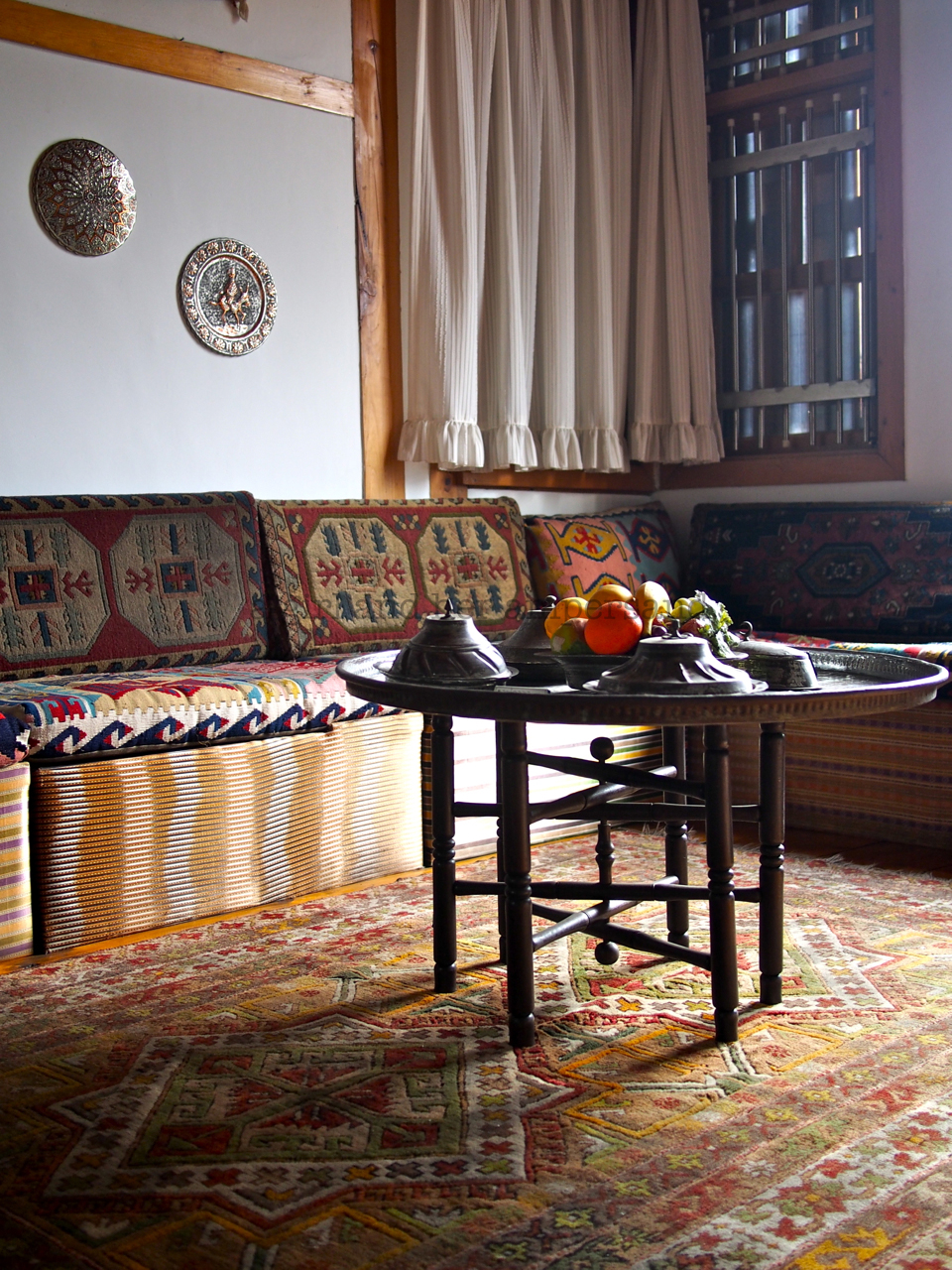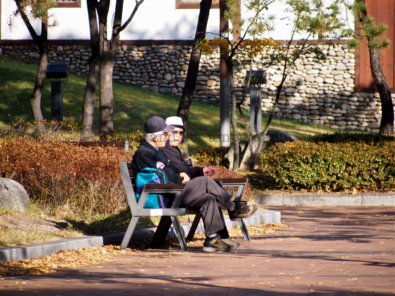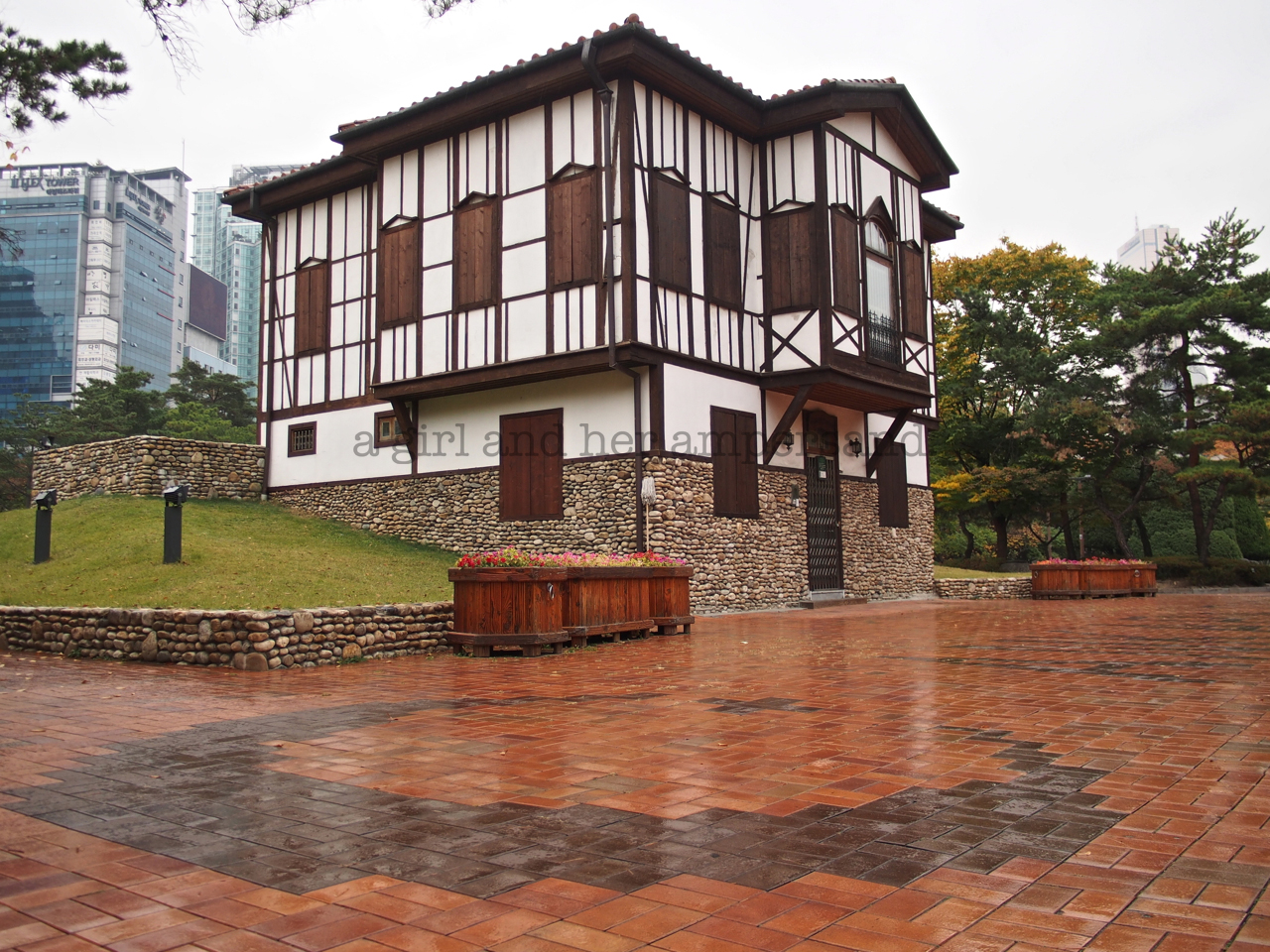 Marking this entrance to the park was a statue of two women with their arms upraised in a gesture of exultation, and besides this, other small sculptures line the walkways that meander between Ankara’s flower beds and well-tended shrubs. Surrounded by these and the usual assortment of exercise equipment and gazebos was the park’s centerpiece, the Traditional Turkish Vineyard House (터키 전통포도원 주택). Built in 1992 and decorated with folk articles brought over from Ankara, the replica house is built into a man-made hill. Stone walls form its lower portion, while the top of the first story and the second story are whitewashed and crisscrossed by slats of plain brown wood. Bay windows with wooden shutters protrude from either side of the home, and atop it all a small chimney sticks out of a red tile roof. All of this gives the building an endearingly rustic and, in comparison with its surroundings, exotic sort of feel, and makes for an arresting sight when viewed through the trees from the sidewalk, especially if you don’t already know it’s there.