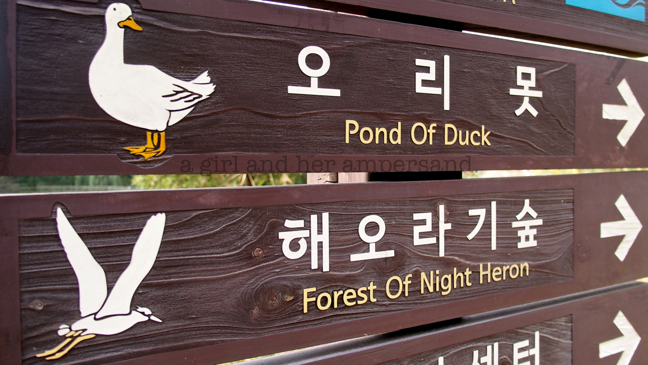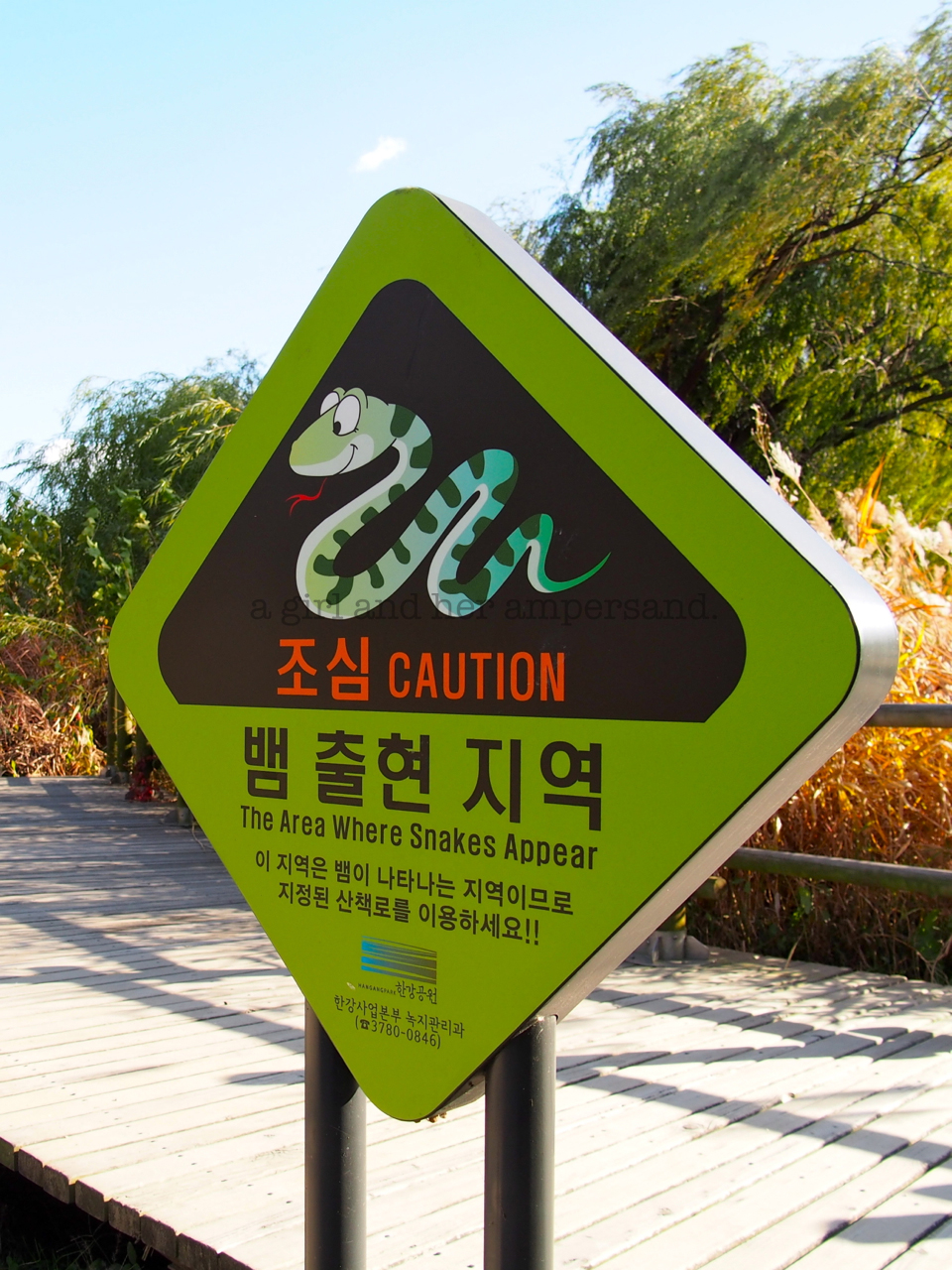 Walking west took me past the Ecology Pond and through a section called the Night Heron Forest, where a sign cautioned visitors about the presence of snakes. The park here was reasonably wide and paths went deeper into the vegetation, sometimes leading to viewing platforms looking out over ponds or streamlets, the occasional willow rising up out of the water. Walking east from where I entered, the park became gradually narrower, and I could make out the hulking billboards on Olympic-daero (올림픽대로) and the shimmering façade of the 63 Building, where I headed next.