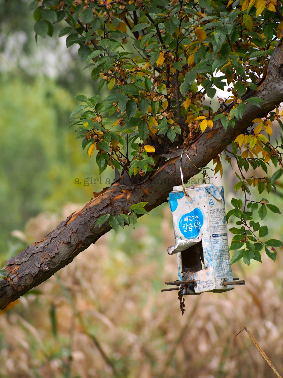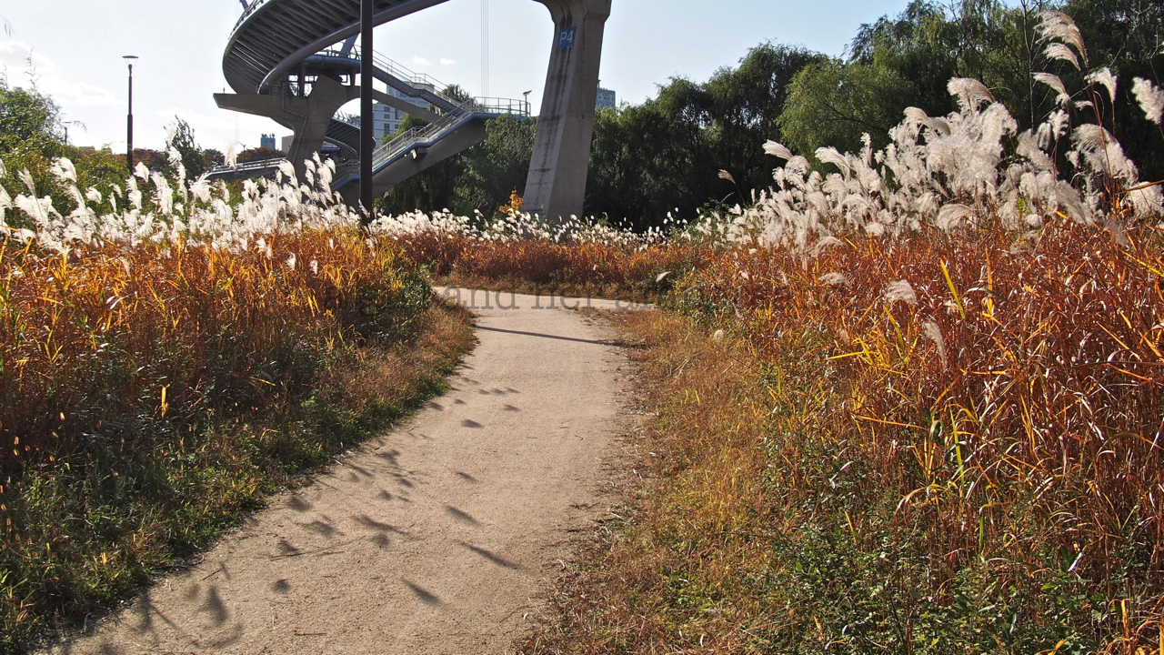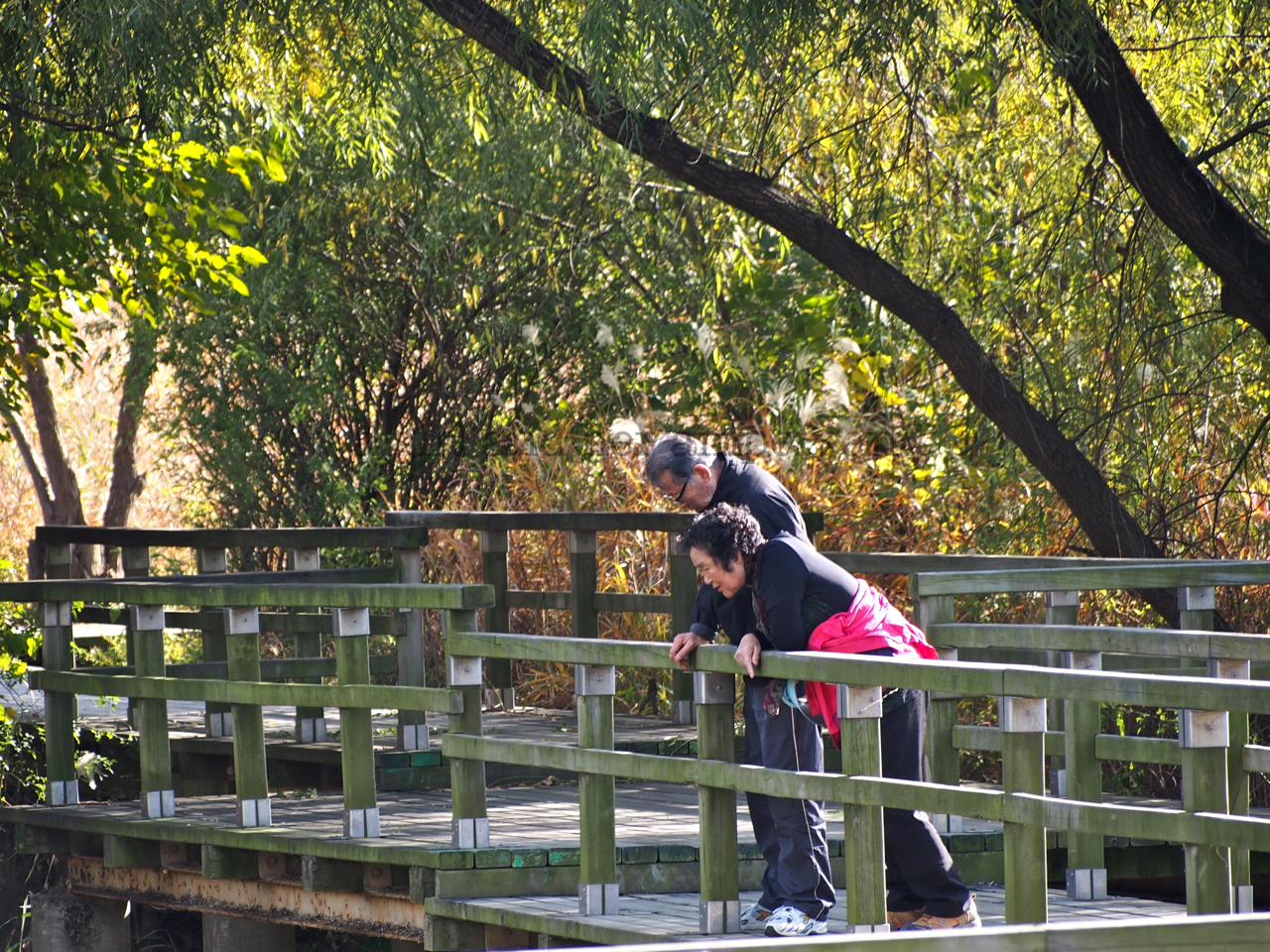 Also within the park is a visitors center and the gorgeous Saetgang Bridge, linking the island and the south bank (both of which are more easily accessed by Yeouido Station), but it’s those walking paths that are the best place to be. Sometimes wooden boardwalks, sometimes dirt paths, they wend between trees, beds of cattails gone fuzzy-topped with autumn, and banks of tan reeds, taller than a person, their downy gray tops bent over in soft hooks. Walking along them I could hear the insistent chirping of birds in the marshes and the occasional rustle of an animal somewhere in the dry reeds. Periodically I’d catch a clear glimpse of the saetgang through the trees, a dull slate or a military olive depending on the light, and now and then I’d spot a heron standing in the shallows, grooming itself, or catch a magpie or mourning dove flapping out of the underbrush and taking to the air.