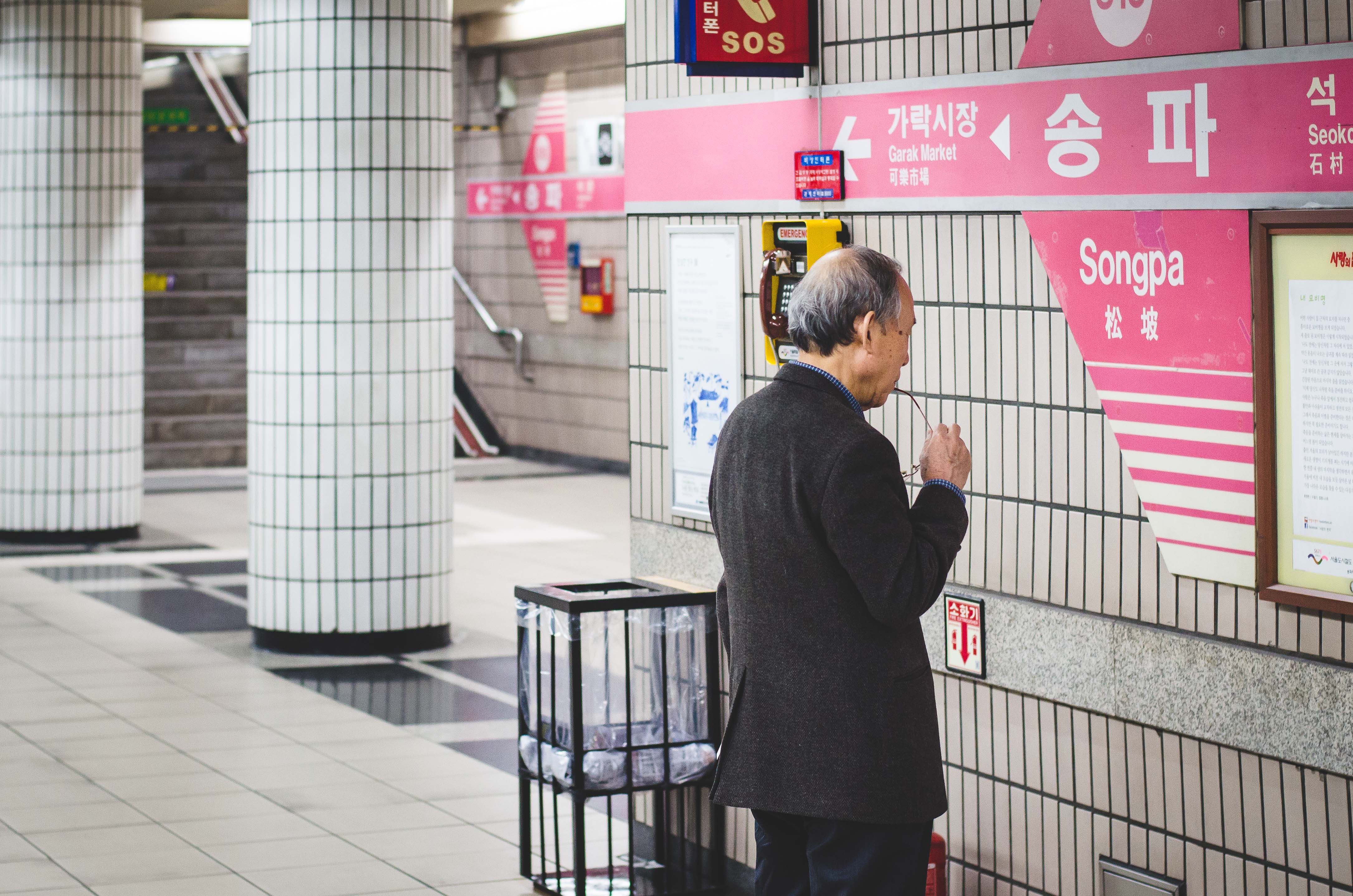 The small scale of the park was in contrast to just about everything around it. Across the road to the south were towering apartment buildings with enormous, horrific mint green mushroom statues in front of them. Separating me from them, Yangjae-daero was a 14-lane expanse of incessant traffic. Perpendicular to it, Songpa-daero was six lanes split by several more that dipped into a tunnel running beneath the intersection. With northbound traffic stopped at a red light, an ajumma, large bag slung over her shoulder, trundled across the nearest three lanes to the tunnel’s guardrail, then walked along its shoulder toward the intersection, presumably making her way, dangerously, to the sprawling Garak Market on the opposite corner. Overhead, a pair of twin-prop planes from the nearby military airstrip passed by. Everything added up to make me feel very small.