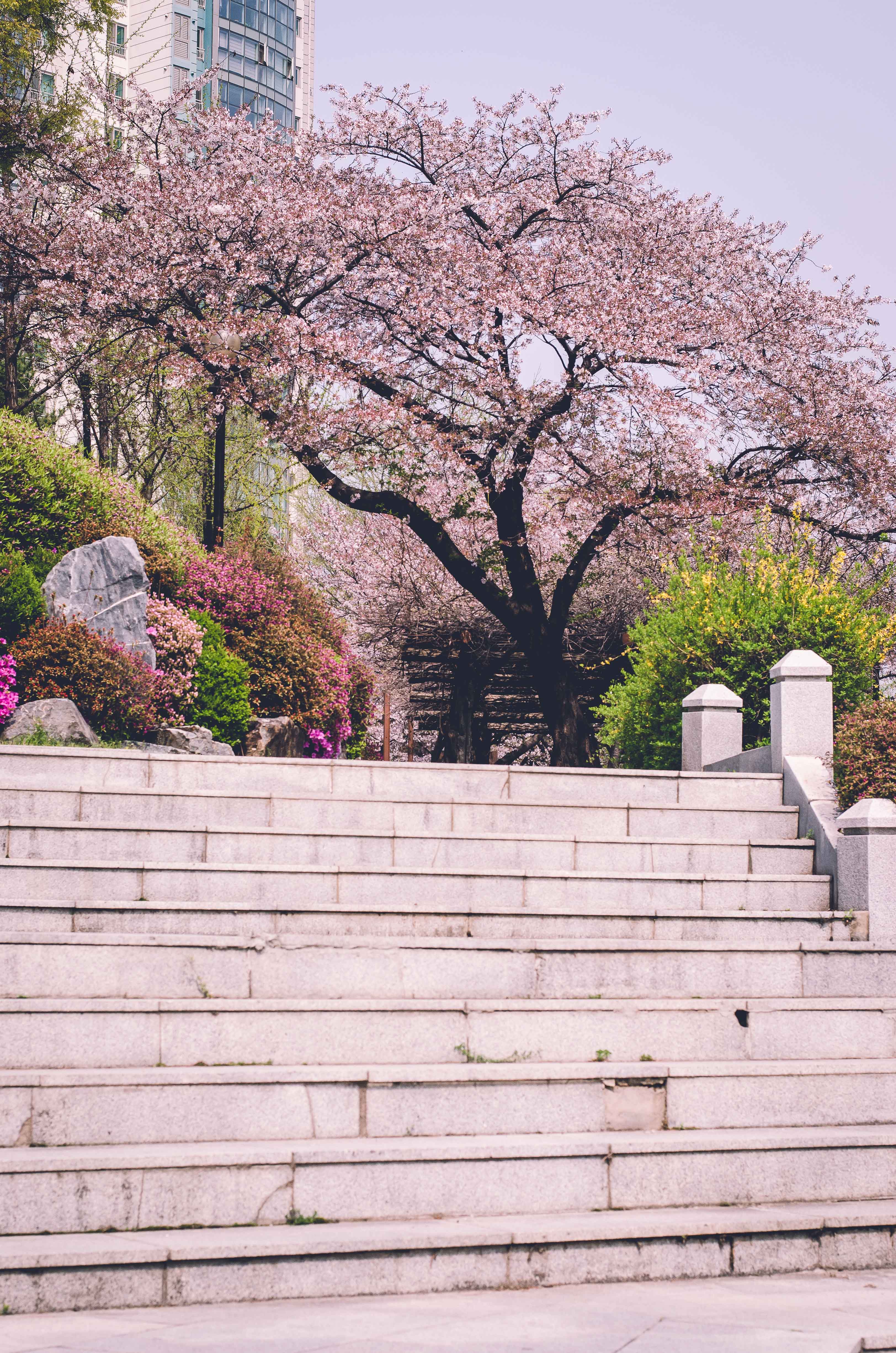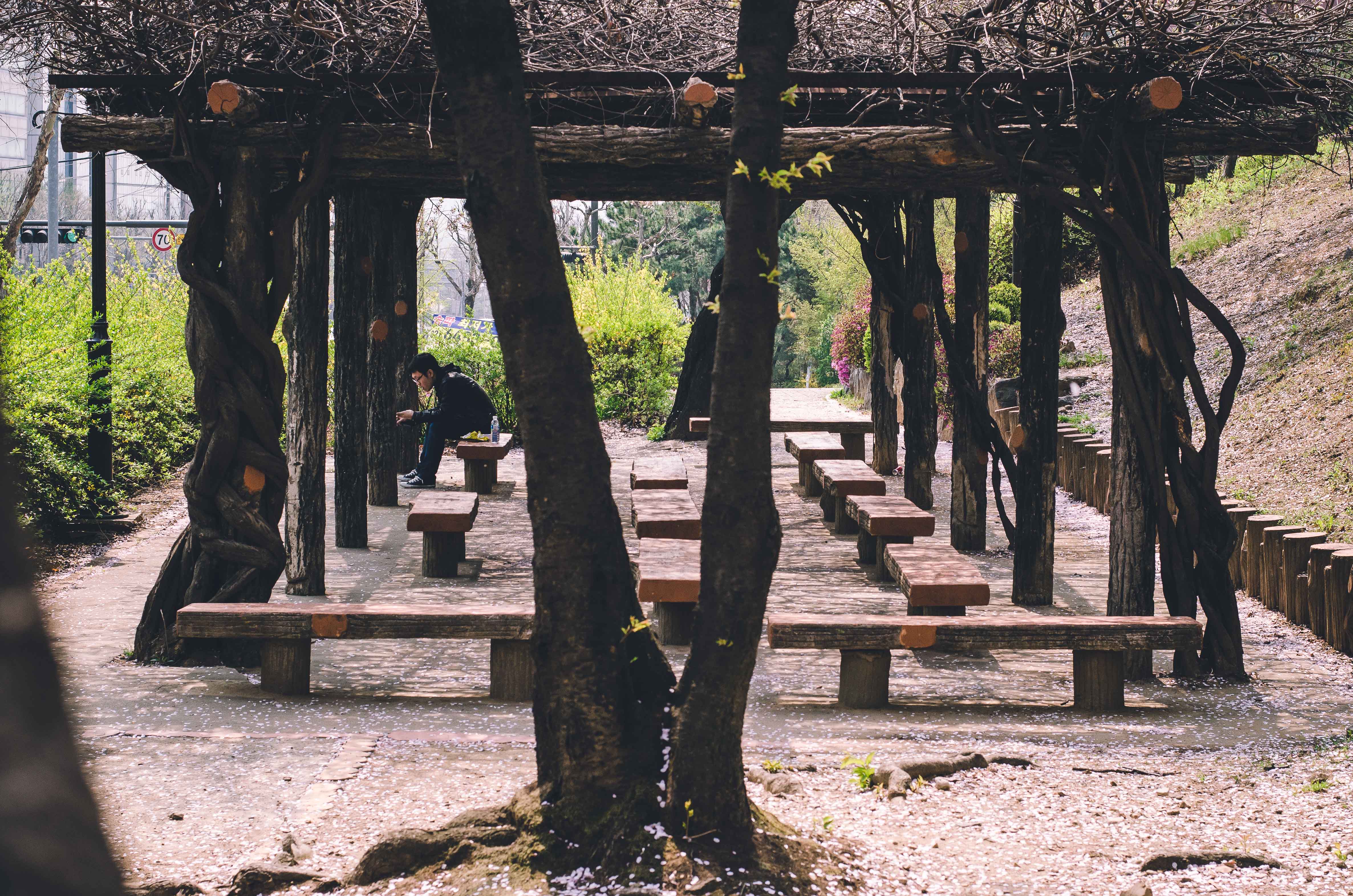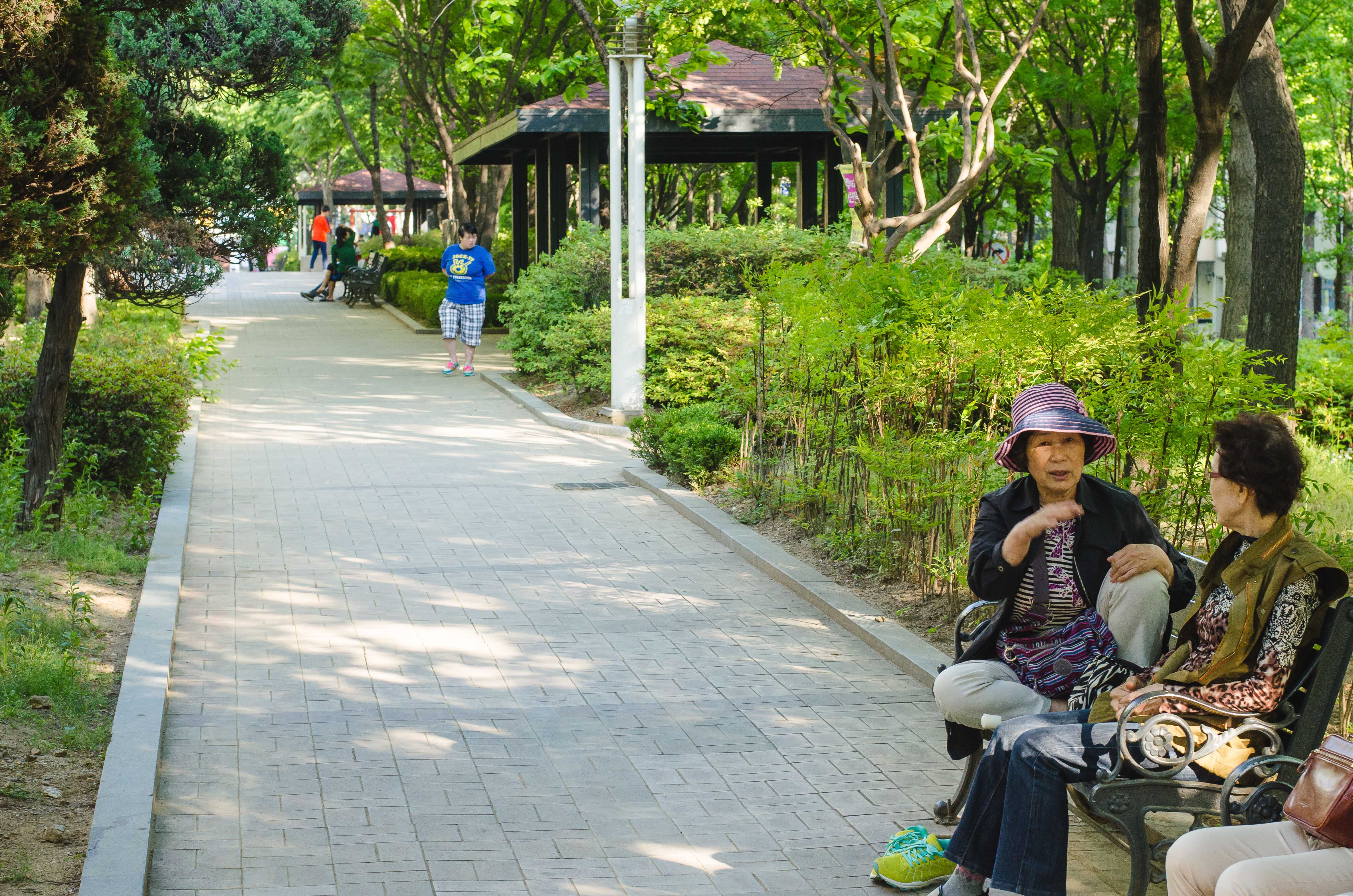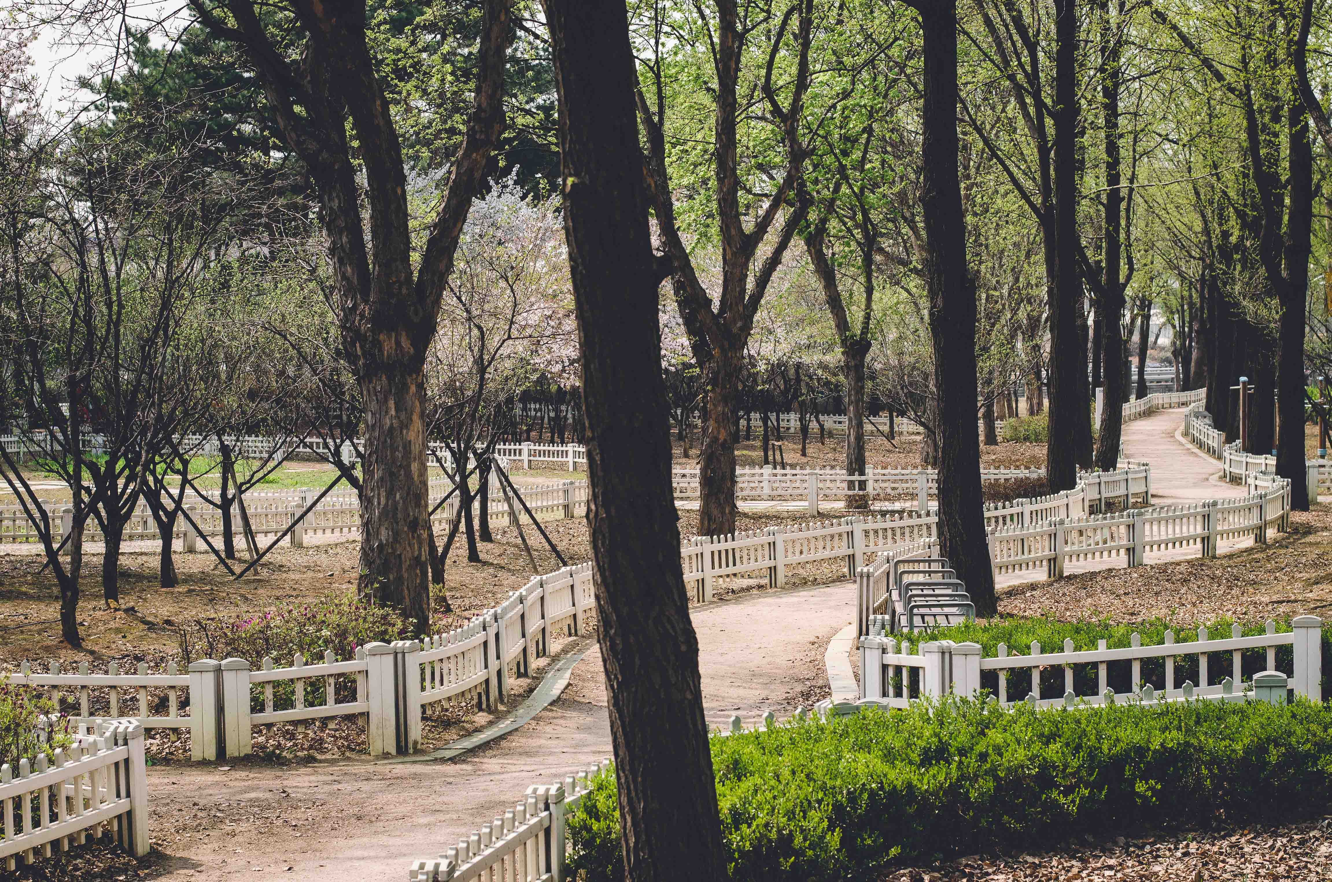 Just outside of Exit 2, a tiny little park is wedged into the corner at the intersection of Songpa-daero (송파대로) and Yangjae-daero (양재대로). There’s a dirt walking path winding through it, the path bordered by a shin-high white plastic picket fence, like something you might see in the same yard as a pair of garden gnomes. Alongside the path were benches and manicured shrubs, and the blossoms on magnolias and cherry trees were just beginning to emerge.