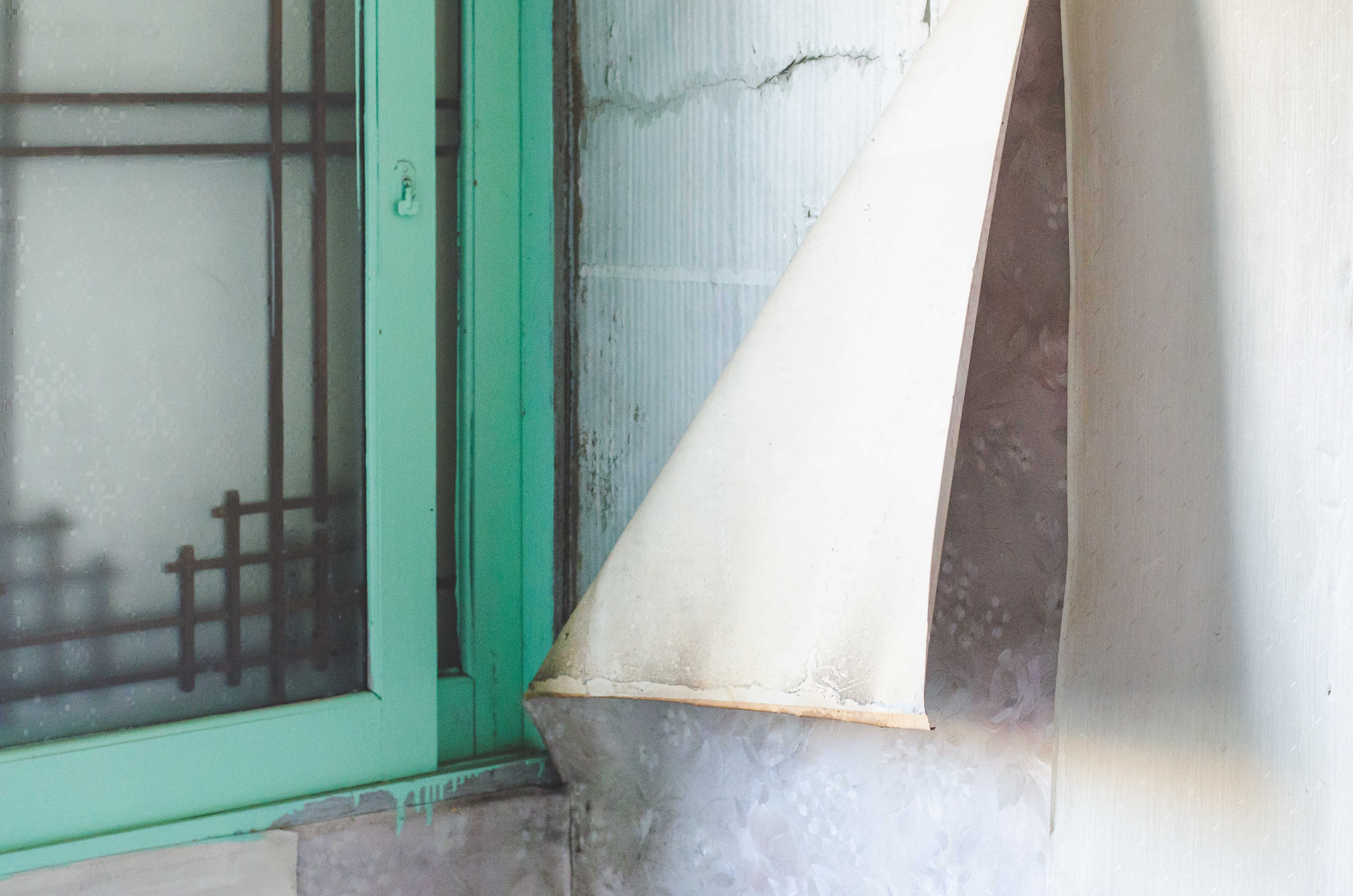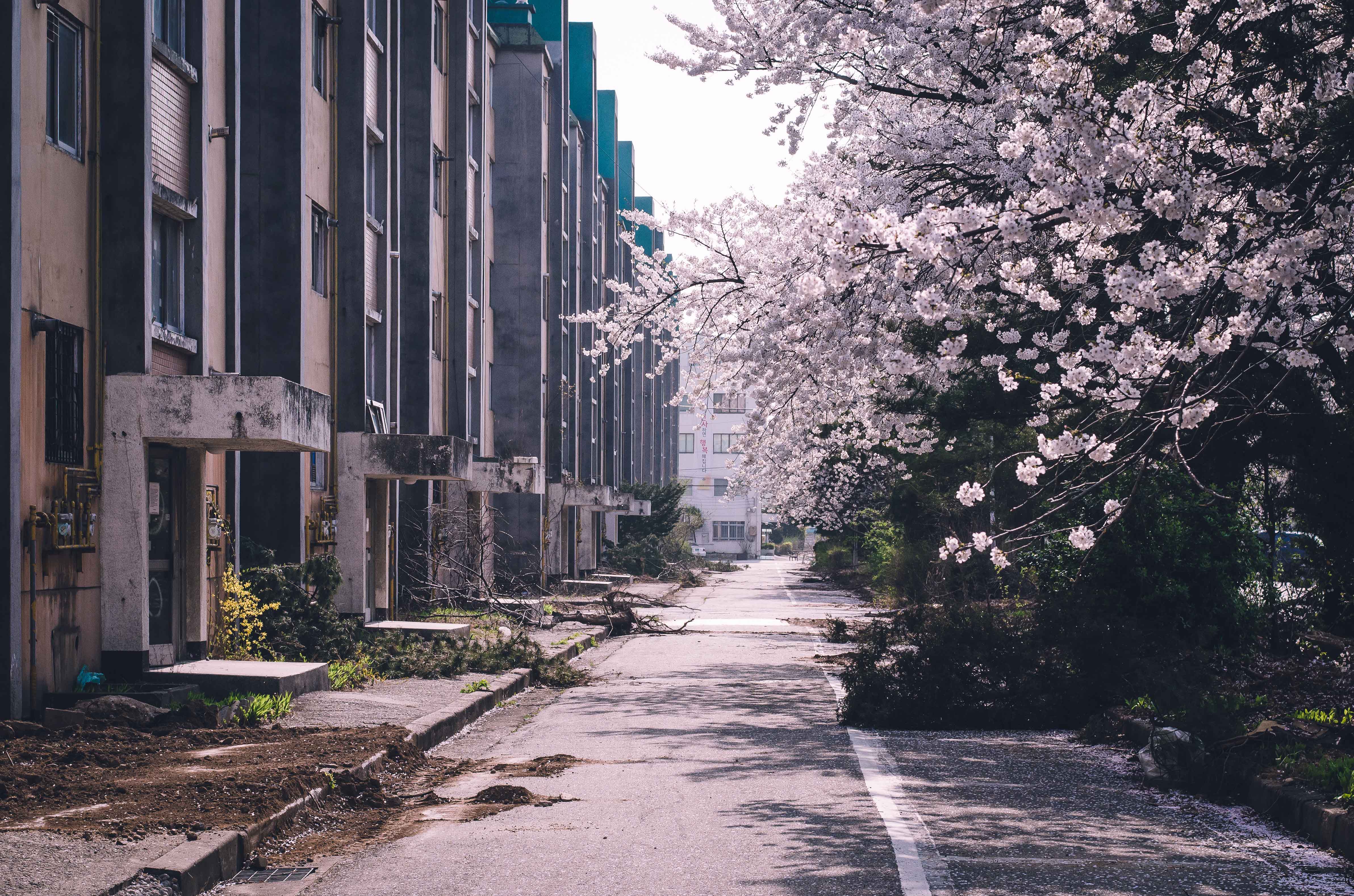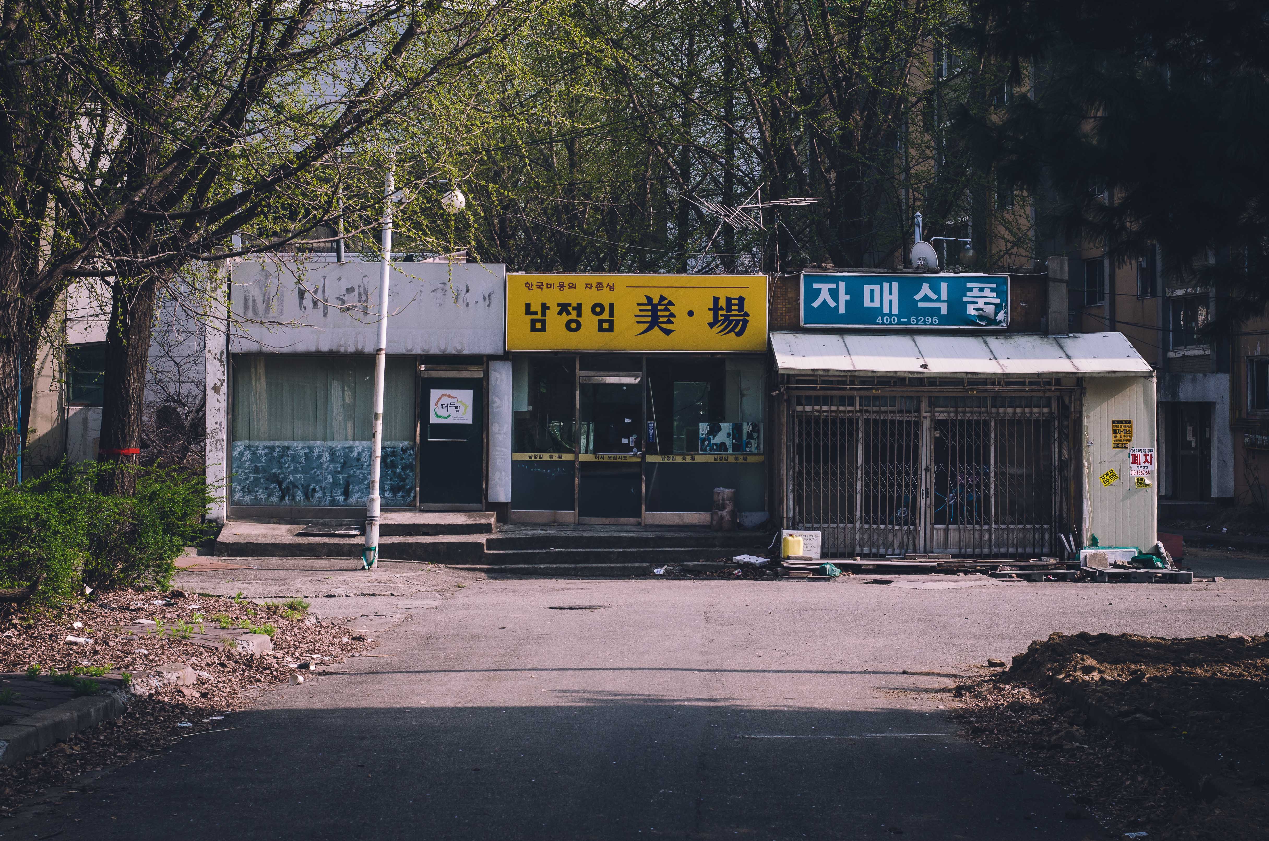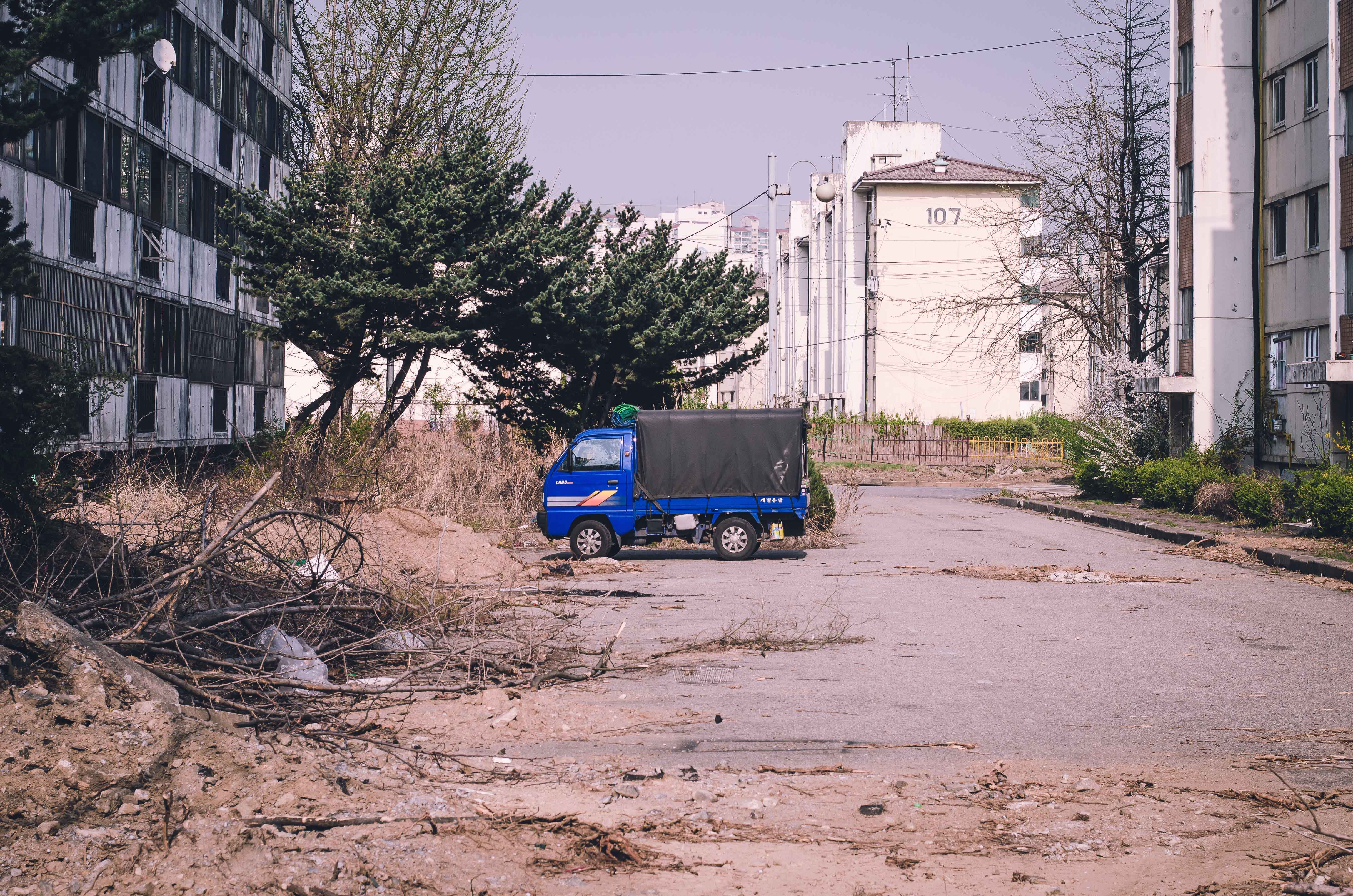 Back outside, I continued to wander up and down the complex’s streets. Trash was strewn indiscriminately, and here and there I had to step around downed tree branches. Bricks had been dislodged from sidewalks, and untended grass and bushes encroached on footpaths between towers. A blooming cherry tree and some roses added an out-of-place beauty, but for the most part the surroundings were grim and anarchic. What was once likely a residents’ center had its doors chained shut. On the sidewalk a box spring’s cover had been ripped off, exposing a rusted skeleton inside. In the middle of one street, a suitcase rested on a stack of bricks, packed up with a carefully placed pile of square stone slabs. Many of the apartment towers’ windows were smashed, others were missing their glass entirely, and on others long lines of windows were still intact but were marked by large ‘X’s spray-painted across them in red, as if someone was using them to mark off days or send some type of cryptic signal. This, I thought, was what the aftermath of the zombie apocalypse would look like if it ever came to Seoul.