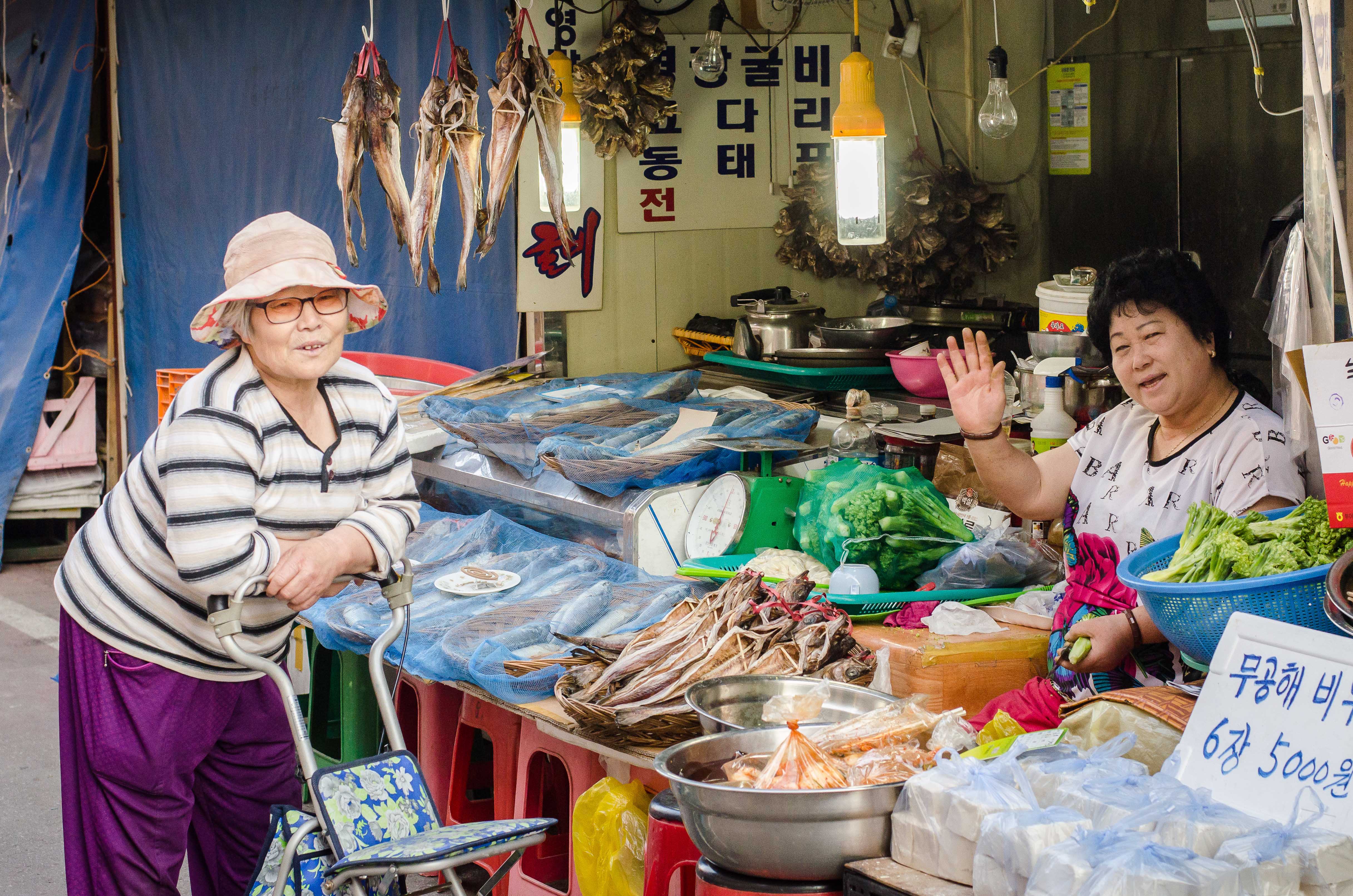 The stretch of Garak-ro to the west of Songpa-daero bore much similarity to its eastern half, with the addition of the slim Seokchon Market (석촌시장), one long line of stalls tucked below apartment buildings on Songpa-daero-31-gil (송파대로31길). About half were open on the afternoon I passed through, each with a small sign listing its number and decorated with a unicorn-horned dokkaebi holding a knobby club. The stalls that were open sold banchan in Styrofoam trays, donuts, dumplings, and fish that smelled again now that warm weather was back. A pair of stray cats hung out in front of a rice cake shop. Halfway down a map listed all of the market’s stalls, different little house icons denoting whether the vendor sold food, produce, clothing, or something else. Tailors in the market mended clothes; a tiny little pet shop sold birds, fish, and rabbits; and boutiques sold clothes for ajummas in colors so violent you wished you saw only in black and white.